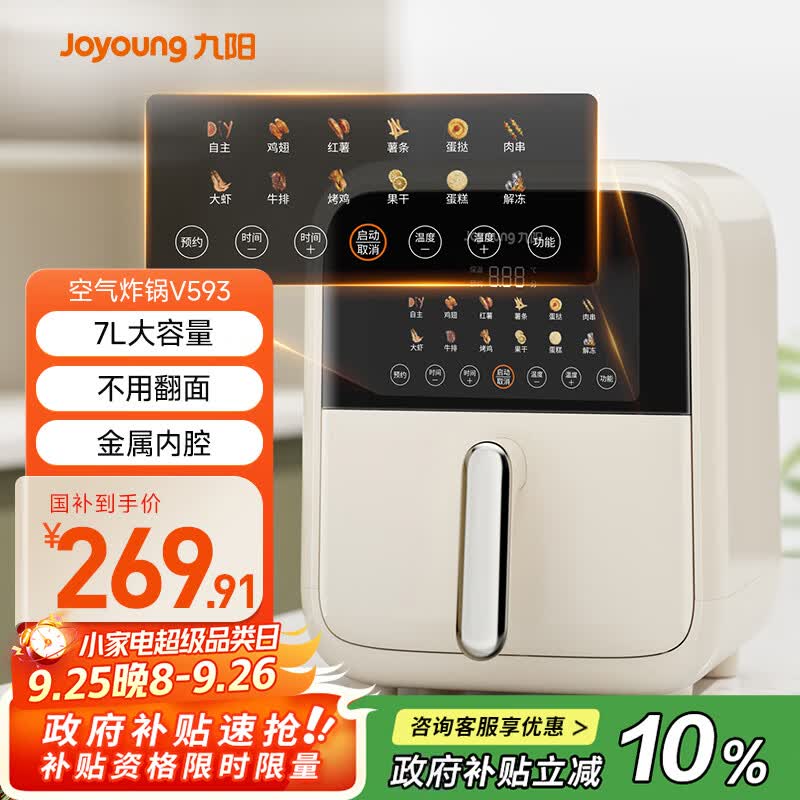 真实揭秘九阳KL70-V593空气炸锅优缺点点评,值得买吗?虽然第一次用空气炸锅,但是苏泊尔的家用电器家里是真不少,这次双十二买了,还是喜欢触屏的,上午做了烤肠忘记拍照片了,很好吃,下午做的蛋挞,还是很智能的,很多食物都有预设,很方便智能,空气炸锅还是很健康的,做小吃的又快又健康送货速度特别快,头天晚上购买的第二天上午就送到了价格对比了一下,这一家比其他店铺的更便宜一些颜值挺高的,挺好看的大小也比较合适,之前买了一个小一点的,但是考不了什么不太方便,所以这次更换了一个大一点的这个性价比还是挺高的。