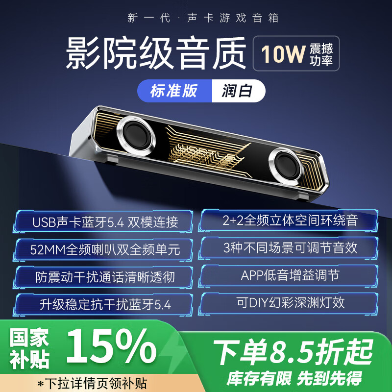 设计样式漂亮,不占空间,可以放在电脑主机上,也可以放在桌子上,还可以竖着放,音效音质也不错,音量调节旋钮丝滑顺畅, USB供电省事方便