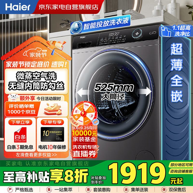 海尔(Haier)滚筒洗衣机带精华洗功能,10公斤大容量 大筒径高洁净,超薄可以平嵌。上一次买洗衣机还是近十年前,现在的智能化和做工外形很惊艳。