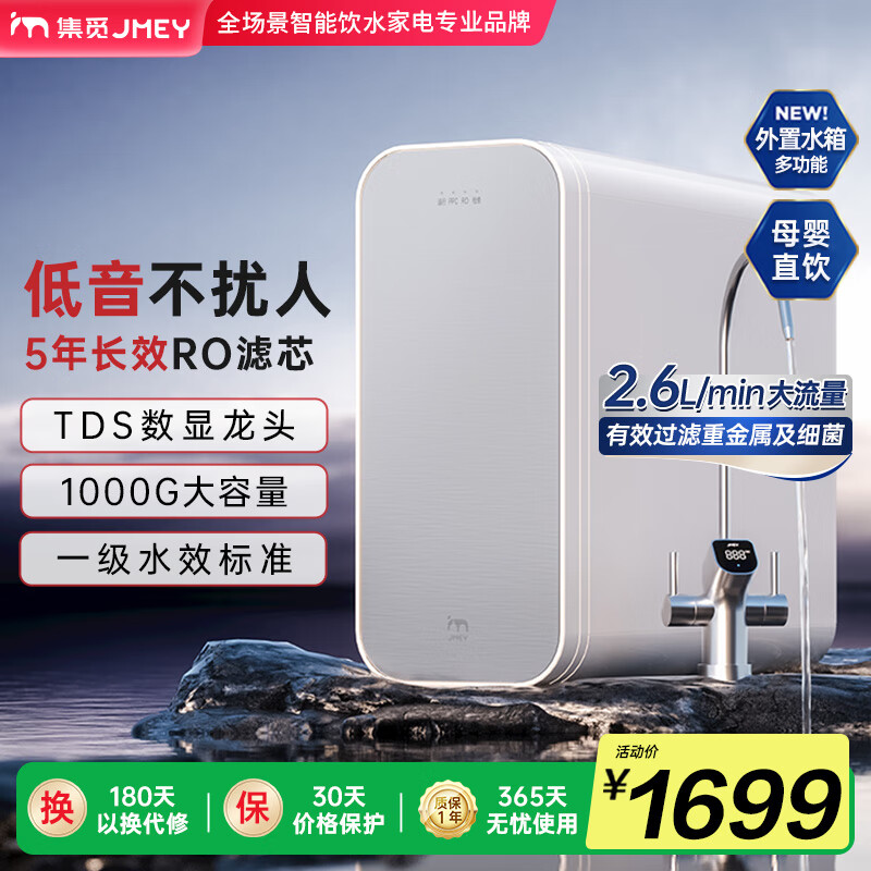 净水机全白色外观,设计简洁大方,尺寸大小合适,完美藏入水槽下面橱柜里。龙头造型也很漂亮,还有led灯显示,滤芯寿命一看便知,双出水,净水洗菜,纯水直饮,出水速度快,流量大,纯水是声音也不大,放橱柜里几乎听不到,真是太方便了。配件齐全,安装简单方便。滤芯寿命超长,更换也很便捷。京东小家App连接后,信息了然。相信京造,买东西有京造,首选京造,物美价廉,不烦神。安装服务:安装师傅热情干活利索。