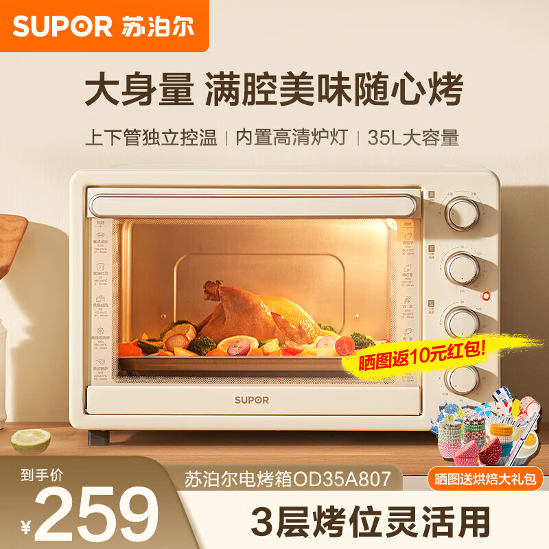 深入解读苏泊尔OJ35A807电烤箱好吗?怎么样?我自己买完一台用着确实好,正好我姐家搬家,我又买一台。内腔是金属的,双层炸篮,用料很良心。功率1700W可以,速度快,上色也均匀。国际大牌品控还是好,感觉炸锅的面积相比同等容量的炸篮要大,跟我妈家的炸锅对比了一下,因为它的炸篮深度较浅,平铺面积大,所以铺的就更多,这点确实很实用。很满意的一次购物。长帝(changdi)家用多功能电烤箱 32升大容量 搪瓷内胆 上下管独立控温 广域调温 机械式旋钮操控已经收到很满意外包装严密无损,上个烤箱也是长帝的用了8年,很好用,现款与老款比较长度变短,高度增高,烤蛋糕更加方便。