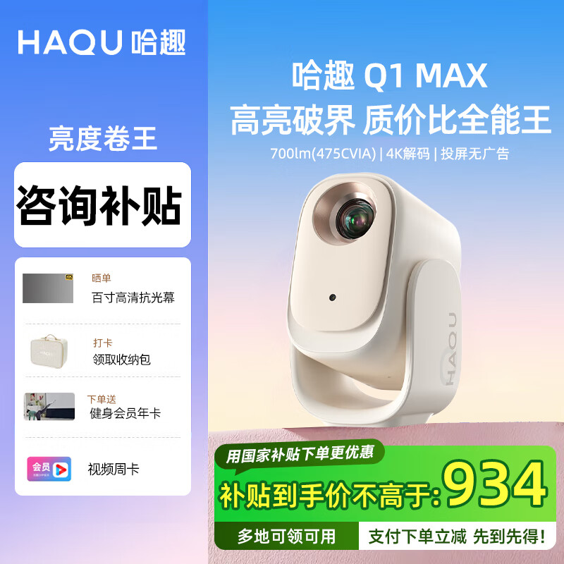 我想问一下哈趣哈趣Q1 Max投影仪参数,好不好?外形外观:长方体外观,黑色外表,体积小投影亮度:对比之下这是千元内流明最高的1400,晚上开灯的情况下也不影响投影色彩:中间会很清晰,周围相比之下显得比较模糊音质音效:音效可以的,声音也很大声操作难易:很简单其他特色:系统有很多影视app可以下载使用,最好的是有斗鱼app,可以直接看直播。而且投屏还是很方便的物流很快,收到货的时候正好当天要去外地,来不及试机,从外地回来后,体验了好几天才来评价,非常喜欢,非常亮,画质可以和电视媲美,设备外观非常好看且有手感,系统非常流畅没有卡顿!还有投屏也使用了,手机投屏清晰流畅,速度快不卡顿,有线投屏也非常好用,亮度足够,音效很好,视频是上午没有拉纱帘的效果,白天的效果拉个纱帘看没问题,晚上效果更好,超级清晰。