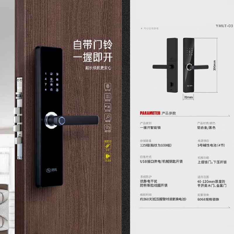吐槽:玥玛YMLT-03指纹锁性价比高吗?好吗?高颜值,高品质,非常好,一分钱一分货,材质外观和质量一看就很上档次,非常喜欢在这里选购安全方便快捷,快递小哥态度非常好,这个价格非常给力,十分推荐,会继续回购本来还很担心东西不好,拿到手发现完全多虑了,五星好评真的推荐啊,快递速度特别的快,爱了爱了之前去朋友家吃饭,被种草的彻底解决了日常指纹开锁失败的,由于 我我的指头是那种,然后特别容易蜕皮的,特别不好使,所以就选择了这款止动脉的这个外观特别简洁大方,使用方便,而且安装师傅上面迅速安装时细心又耐心,真的,真的是一次不错的过,真的是一次不错的购物体验